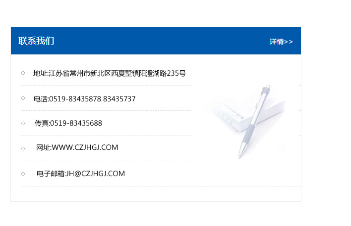 地址:常州市新北區友邦商務大廈1幢16、17層  電話:0519-85101652  傳真:0519-85112595  郵編:213022  網址:www_cz-jiayue_cn.jssbjd.com  郵箱:xiajifengaa@163.com